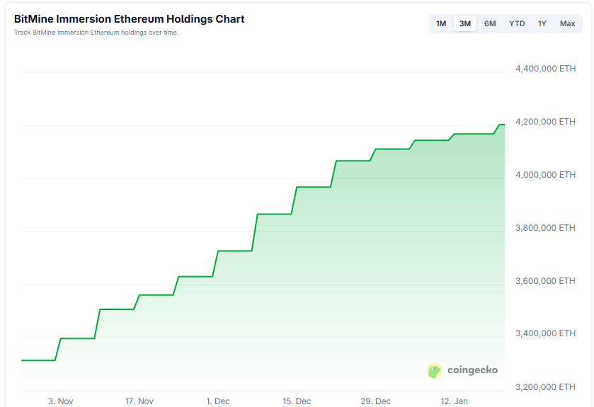The New York–listed firm disclosed on January 20 that it now holds 4,203,036 ETH, valued at roughly $13.5 billion at recent prices, following weeks of steady purchases made during market weakness.