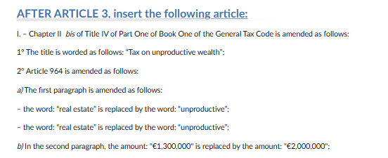 The amendment would replace France’s existing Impôt sur la Fortune Immobilière (IFI), the real estate wealth tax, with a broader Impôt sur la Fortune Improductive (IFI 2.0), or “tax on unproductive wealth.”